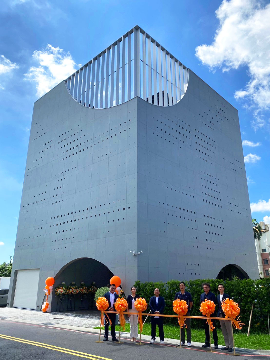 黃智峯在開幕典禮上表示,大樓外牆採用簡約穩重的清水模設計,投入大量時間與心力來打造獨特的手作風格。也運用通透的玻璃建材,營造出輕重對比的空間體驗,每一處細節都體現了對太陽能未來的深刻思考。外牆上方的弧形設計靈感來自太陽的軌跡,象徵著日出與日落,賦予建築動態美感與深刻意涵。弧形開口與高樓層的空中花園及都市景觀相互呼應,也為一樓創造充滿交流與互動的公共空間。