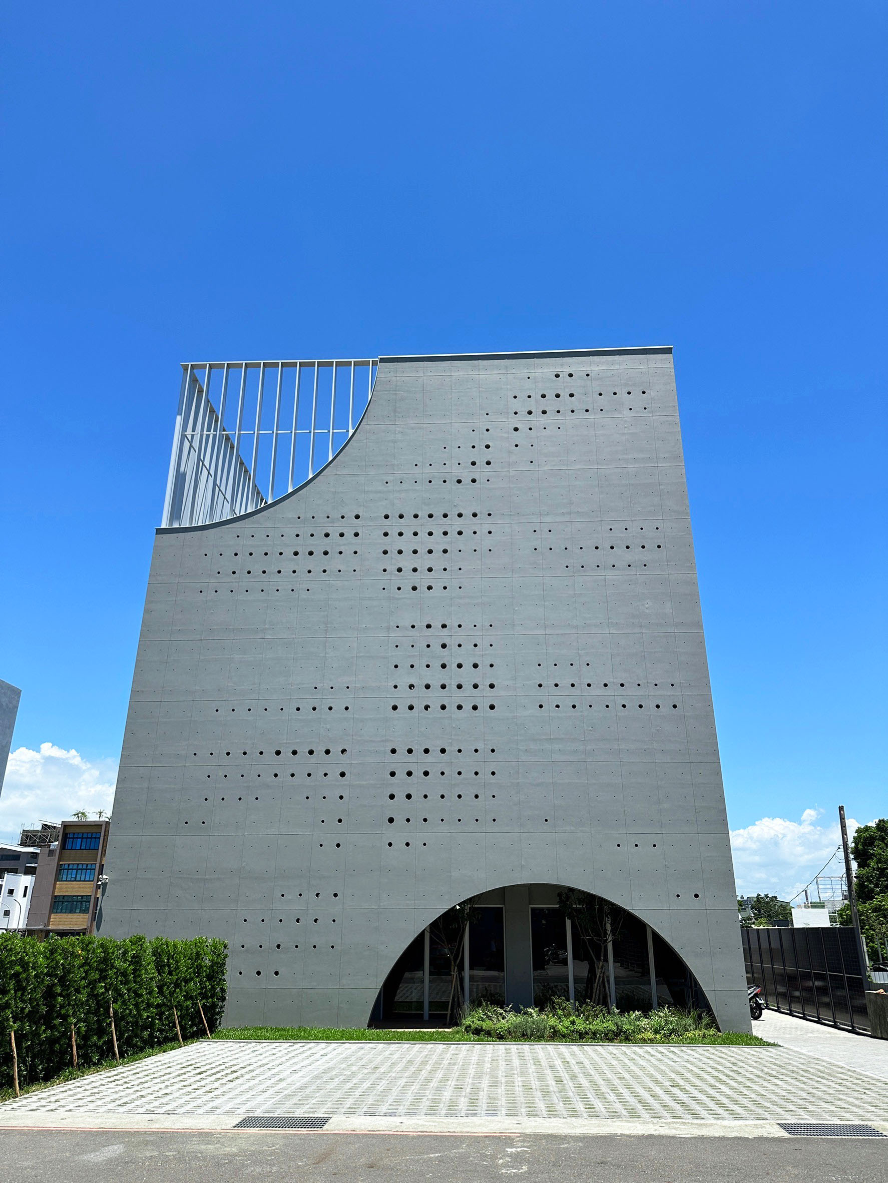 「日光軌跡」大樓外牆採用簡約穩重的清水模設計,成為當地的地標建築。 陽光花園/提供