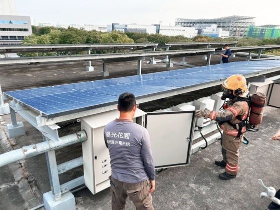 台南市政府消防局第四救災救護大隊與陽光花園於聯奇開發樹谷服務中心、樹谷生活科學館聯合舉辦太陽能系統救災演練。陽光花園/提供